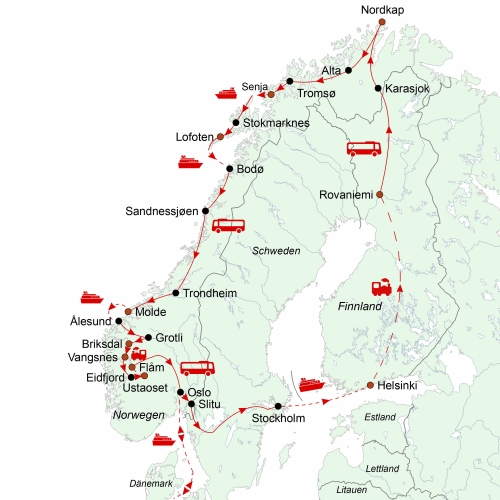 Zu jedem guten Skandinavienprogramm gehört eine Reise zum nördlichsten Punkt Europas – wir bieten Ihnen davon sogar mehrere Varianten, so dass Sie bei uns die „Qual der Wahl“ haben. Diese Reise führt durch Schweden, Finnland und Norwegen und ist unsere längste Tour zum Nordkap. Eine solche Reise durch die drei Länder, die wir seit über 30 Jahren durchführen, hat viel mehr zu bieten als das Erlebnis der Mitternachtssonne. Da sind die großen Städte Oslo, Stockholm, Helsinki, Tromsø, Trondheim und Bergen, die Sie bei dieser Reise alle besuchen werden, aber auch die Inselwelt der Schären vor der Küste Schwedens, die unendlich erscheinende Seenplatte Finnlands, die riesigen Wälder Lapplands, die vom Golfstrom geprägte Küste Norwegens, die traumhafte Inselwelt der Lofoten sowie die Fjorde und Fjelle Westnorwegens. Sie verbringen bei dieser Reise zwei Tage in Schweden und vier Tage in Finnland, aber der Schwerpunkt liegt in dem faszinierenden und abwechslungsreichen Norwegen. Insbesondere unsere Streckenführung in Nordnorwegen bietet unvorstellbare Höhepunkte. Insbesondere unsere Streckenführung in Nordnorwegen bietet unvorstellbare Höhepunkte. So fahren wir am 12. Reisetag über die reizvolle Insel Senja und kommen anschließend auf die Vesterålen, wo Sie drei Nächte in Sortland wohnen werden. Von dort aus erkunden Sie die Inselgruppen der Vesterålen und Lofoten, die beide mit zu dem schönsten gehören, was Norwegen zu bieten hat. Auch eine Schifffahrt auf der Postschiffroute durch den Raftsund von den Lofoten zu den Vesterålen gehört zum Programm dieser einzigartigen Reise. Auch die Fahrt über die Küstenstraße an der Helgelandsküste am 16. und 17. Reisetag ist etwas ganz Besonderes - sie wird aufgelockert durch den Besuch des Svartisen-Gletschers und des Torghatten sowie insgesamt 6 Fährüberfahrten. Die drei Nachtfahrten an Bord moderner Fährschiffe runden das Gesamtbild einer Reise ab, die Ihnen nicht jeder Reiseveranstalter bietet. Für viele unserer Reisegäste wird eine Reise zum Nordkap zu einem unvergesslichen und unvergleichlichen Erlebnis. Das hängt sicherlich auch damit zusammen, dass wir auch bei dieser Reise Strecken fahren, die die meisten anderen Veranstalter nicht nutzen.