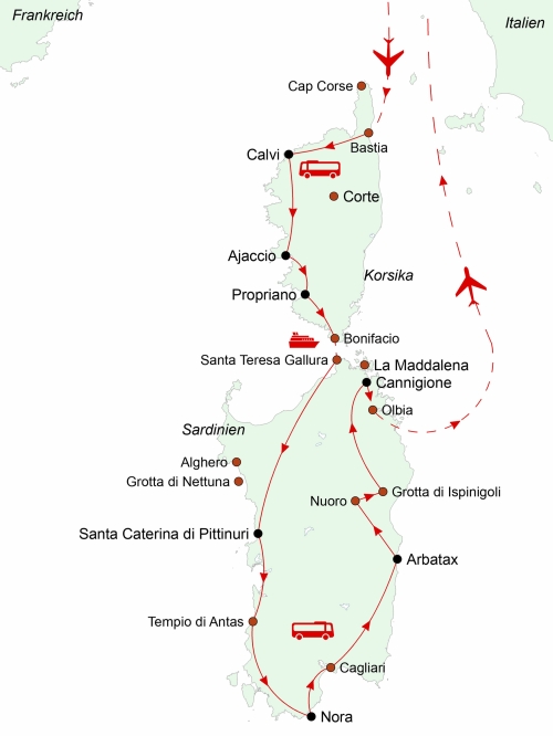 Hinflug nach Bastia – Cap Corse – 6 Nächte in Calvi – Calanche – Corte – Aléria – Ponte Novu – Schifffahrt nach La Scandola – Girolata – Balagne – Lumio – Porto – Ajaccio – Filitosa – Sartène – Bonifacio – Tharros – Bosa – Alghero – Grotta di Nettuno – Tempio di Antas – Nora – Cagliari – Su Nuraxi – Arbatax – Schifffahrt zur Feigengrotte – Hochebene von Golgo – Nuoro – Grotta di Ispinigoli – Capo Testa – Gigantengrab von Arzachena – Costa Smeralda – Olbia – Inselwelt von La Maddalena – Rückflug von Olbia