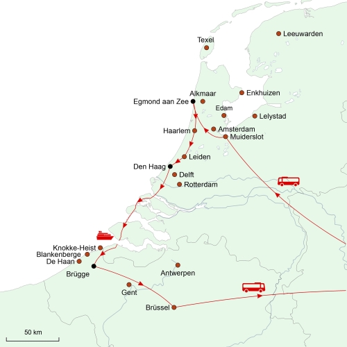 Schloss Muiderslot – Zuidersee-Museum – Egmond aan Zee – Amsterdam – Bataviawerft – Ijsselmeer – Leeuwarden – Afsluitdijk – Alkmaar – Edam – Volendam – Zaanse Schans – Texel – Haarlem – Leiden – Scheveningen – Den Haag – Delft – Rotterdam – Kinderdijk Mühlenanlage – Deltawerke – Brügge – Knokke-Heist – Blankenberge – De Haan – Gent – Antwerpen – Brüssel