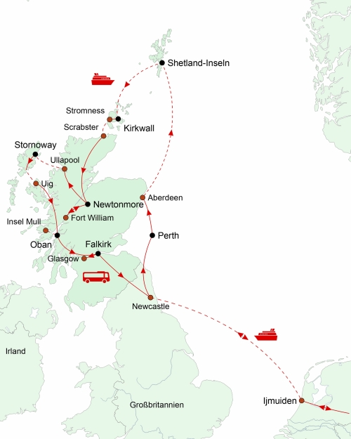 - Fährüberfahrten Lerwick – Kirkwall und Stromness – Scrabster (Tagesfahrten ohne Kabinen)