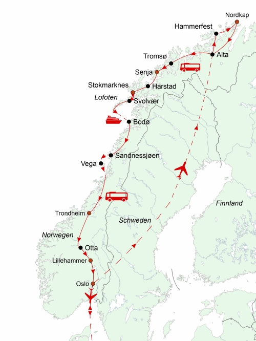 Sie beginnen diese Reise mit den Besuchen von Hammerfest, des Nordkaps, von Alta und dem schön gelegenen Tromsø, welches die größte Stadt Nordnorwegens ist. Von dort geht es in reizvollen Etappen immer weiter Richtung Süden. Auf dieser Reise erleben Sie die eindrucksvolle Inselwelt Nordnorwegens mit der wilden Region Senja und der abwechslungsreichen Inselgruppe der Vesterålen und verbringen zwei Nächte auf den Lofoten, wo wir Ihnen bei einigen Ausflugsfahrten viel von dieser Inselgruppe zeigen werden, die mit zu dem Schönsten gehört, was Norwegen zu bieten hat.
